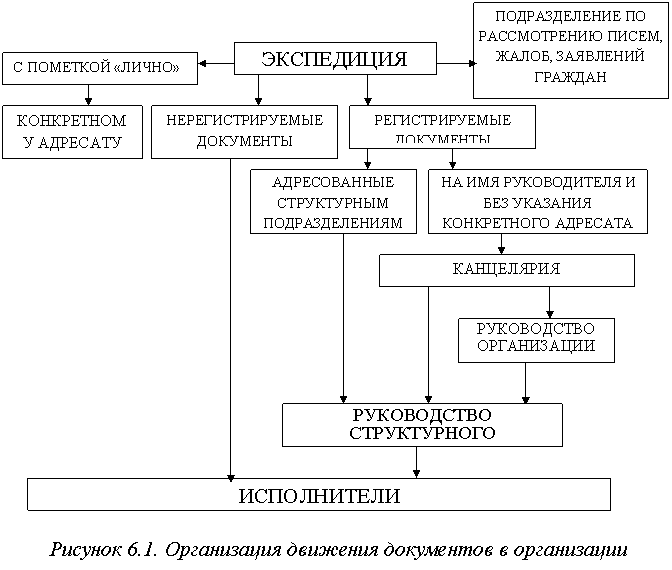 Документы, поступившие, в организацию начинают свой путь к исполнению с экспедиции (структурного подразделения общего отдела) (Рисунок 6.1). Там они подвергаются экспедиционной обработке, которая заключается в проверке правильности доставки корреспонденции, вскрытии конвертов, проверке целостности вложений и предварительной сортировке документов на регистрируемые и нерегистрируемые. Нерегистрируемые документы и документы с пометкой «лично» передаются по назначению. В организации (учреждении) обязательно составляется перечень нерегистрируемых документов, который ежегодно пересматривается.